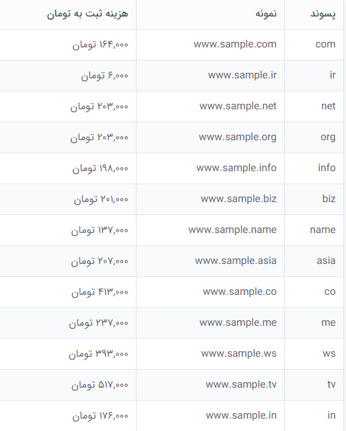 برای اطلاع از هزینه همۀ دامنهها، جدول زیر را برای شما قرار دادهایم.